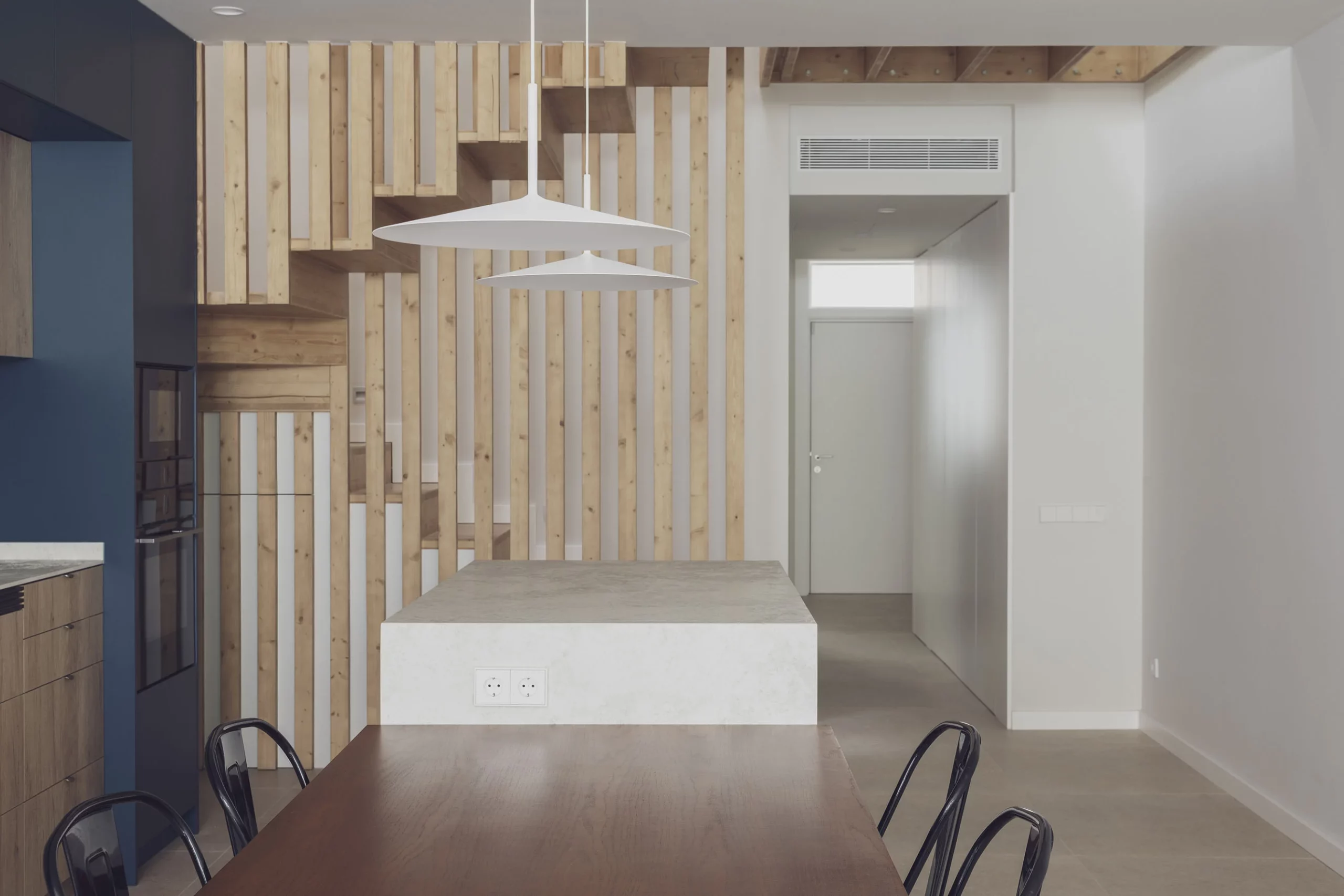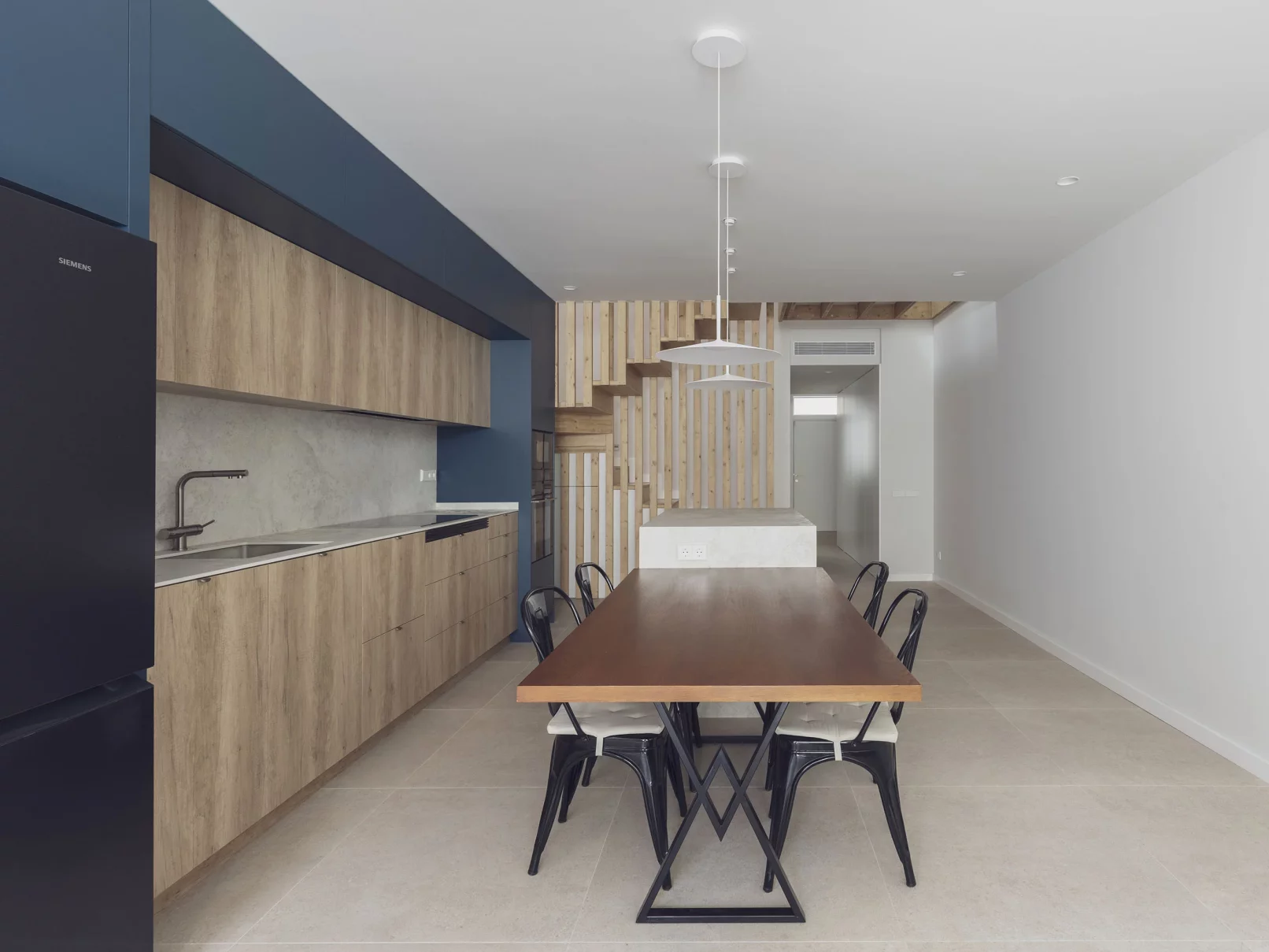 - La nova configuració de l’escala permet reorganitzar les plantes baixa i primera, adaptant l’espai a les necessitats actuals de la família. La cuina amb illa central s’integra amb el menjador, la sala d’estar i el pati posterior, creant un espai ampli, obert i lluminós que afavoreix la convivència diària.