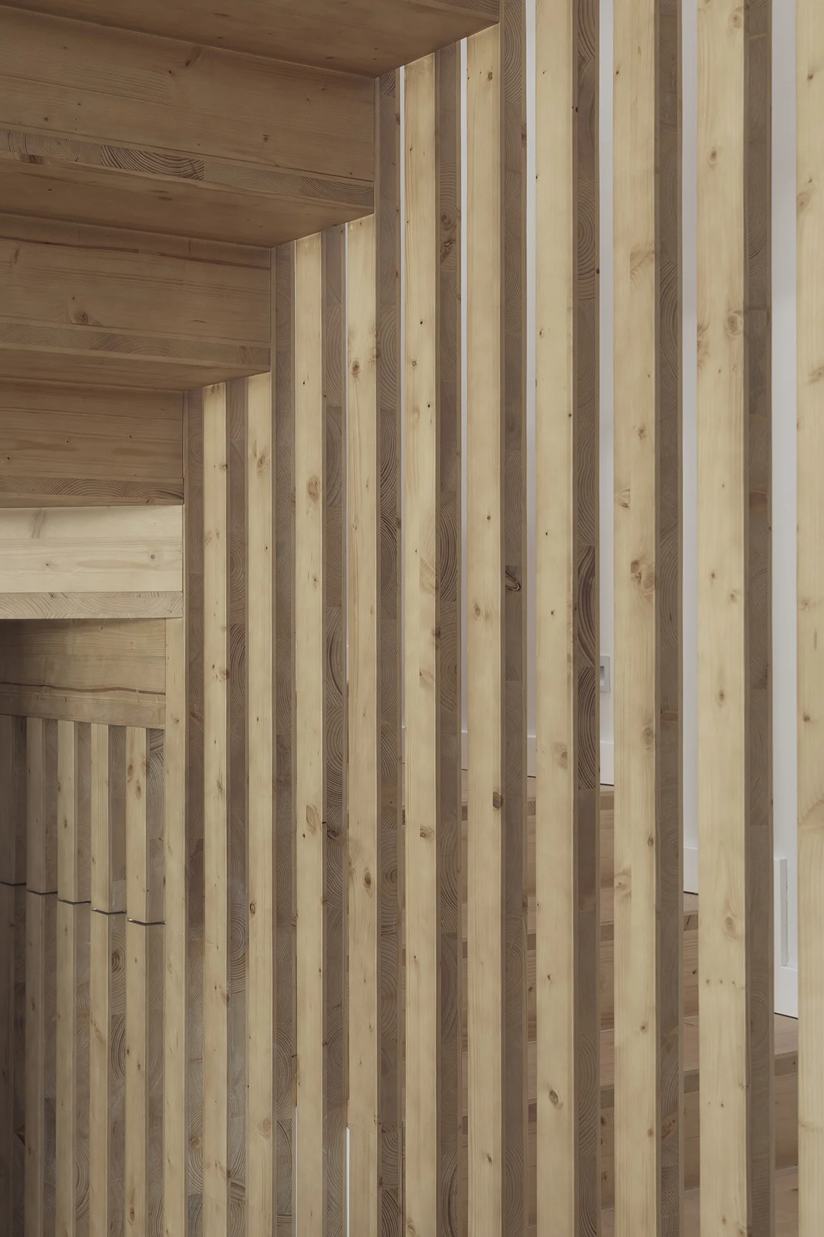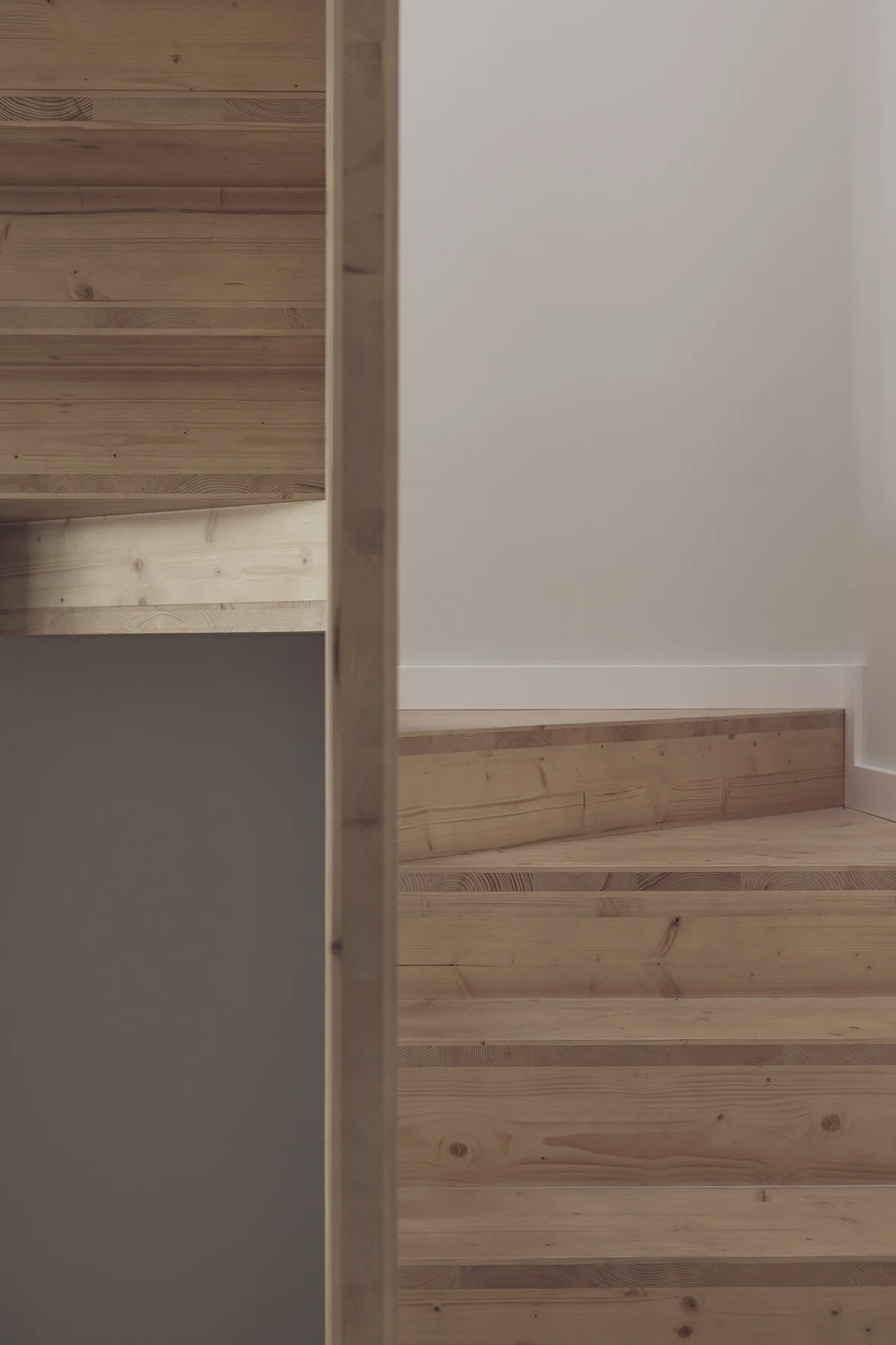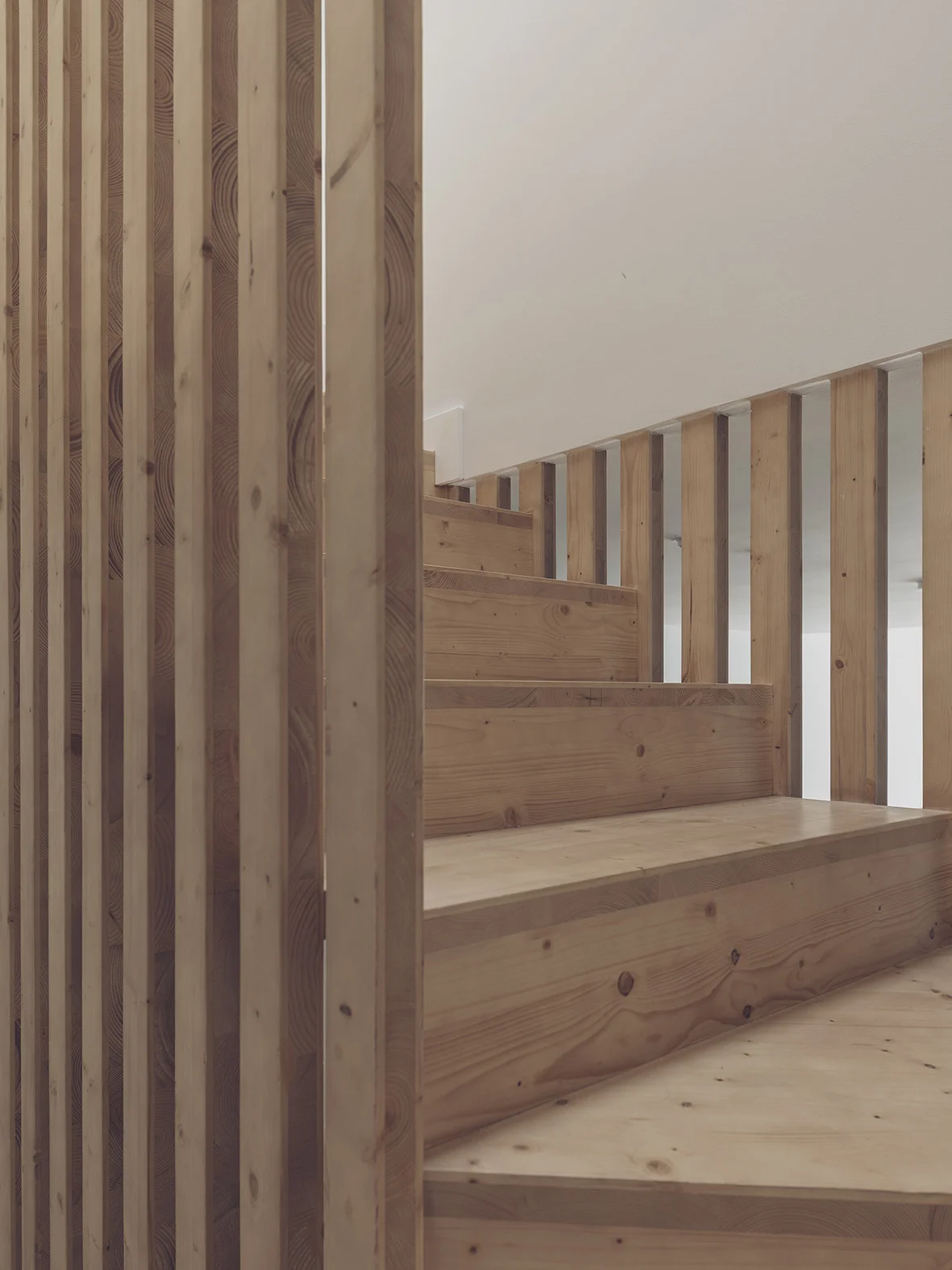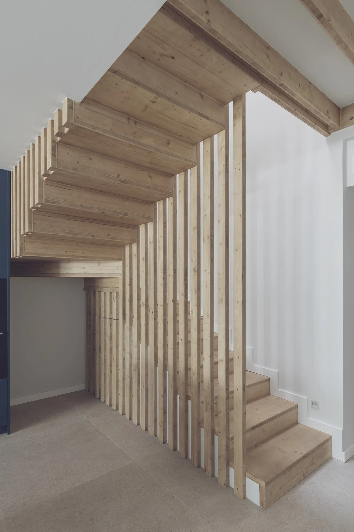 - La fusta és el material protagonista del projecte. Present en estructures, revestiments i mobiliari, aporta calidesa i confort natural als espais interiors. Les bigues laminades de pi formen l’estructura de la coberta lleugera, mentre que els panells tricapa del mateix material defineixen el nucli d’escala. Més enllà de la seva bellesa, la fusta contribueix al control higrotèrmic i al benestar ambiental de la casa.
