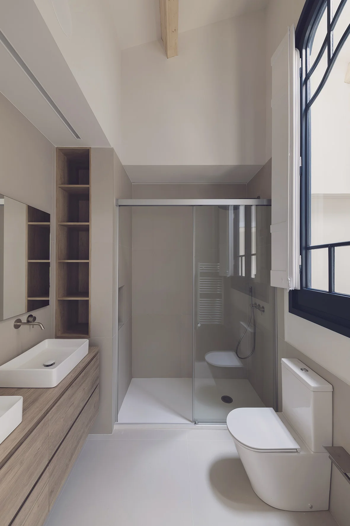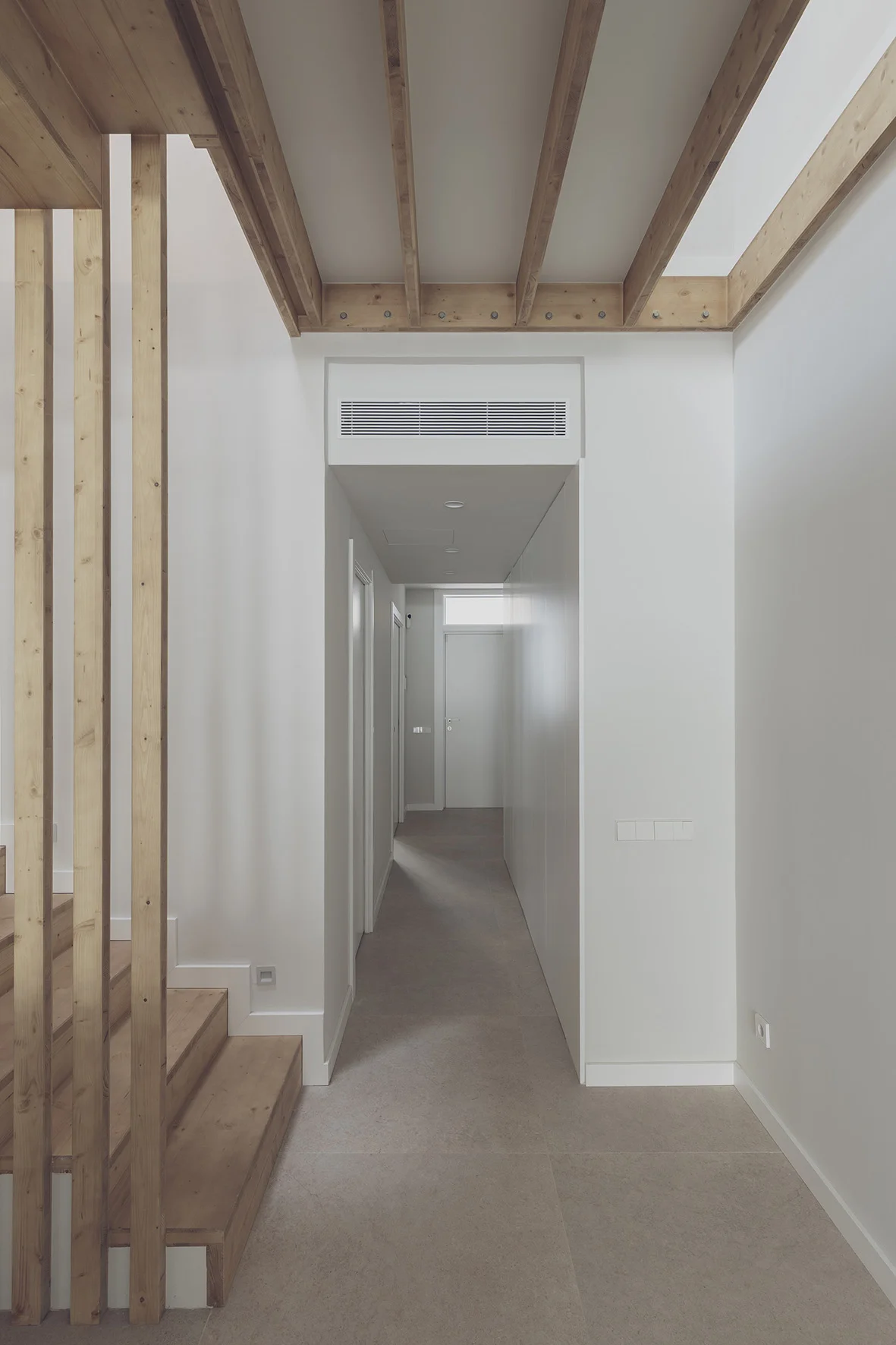 - Pel que fa a l’eficiència energètica, l’habitatge s’ha aïllat completament —coberta, solera, parets mitgeres i façanes— i incorpora plaques fotovoltaiques integrades a la coberta. Aquestes, juntament amb un sistema d’aerotèrmia, terra radiant i climatització per conductes, permeten assolir un alt nivell de confort amb un consum energètic mínim.