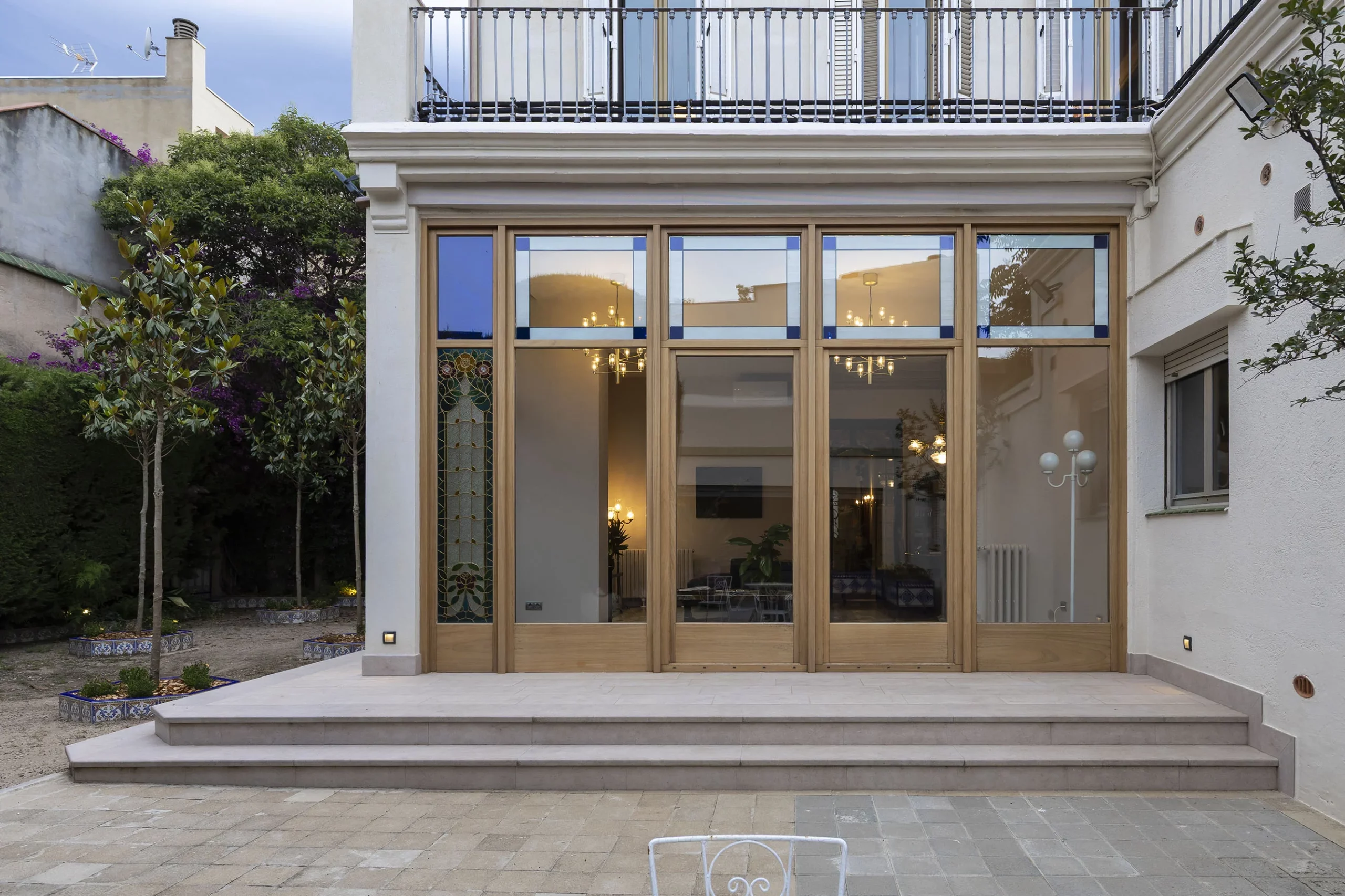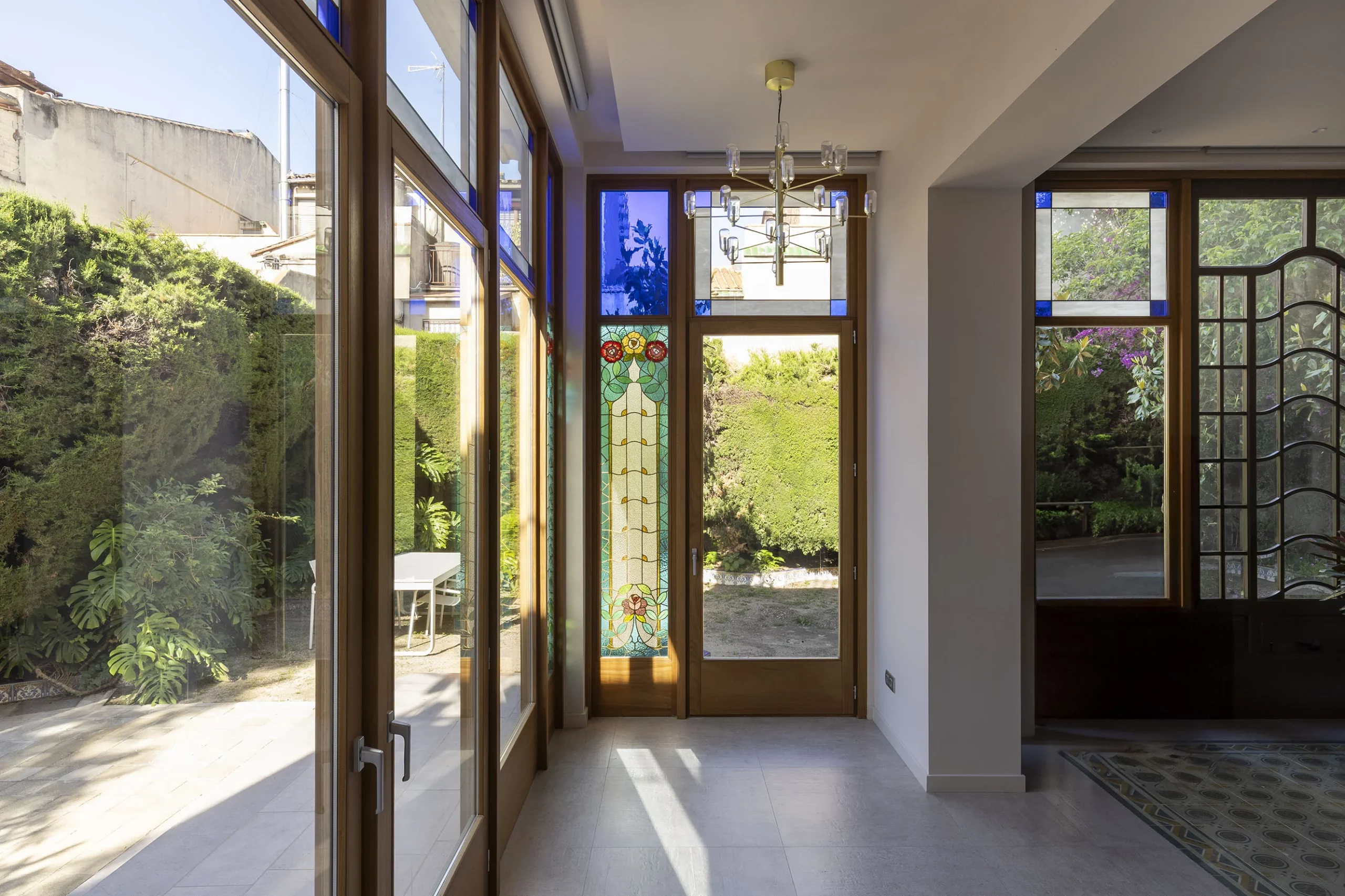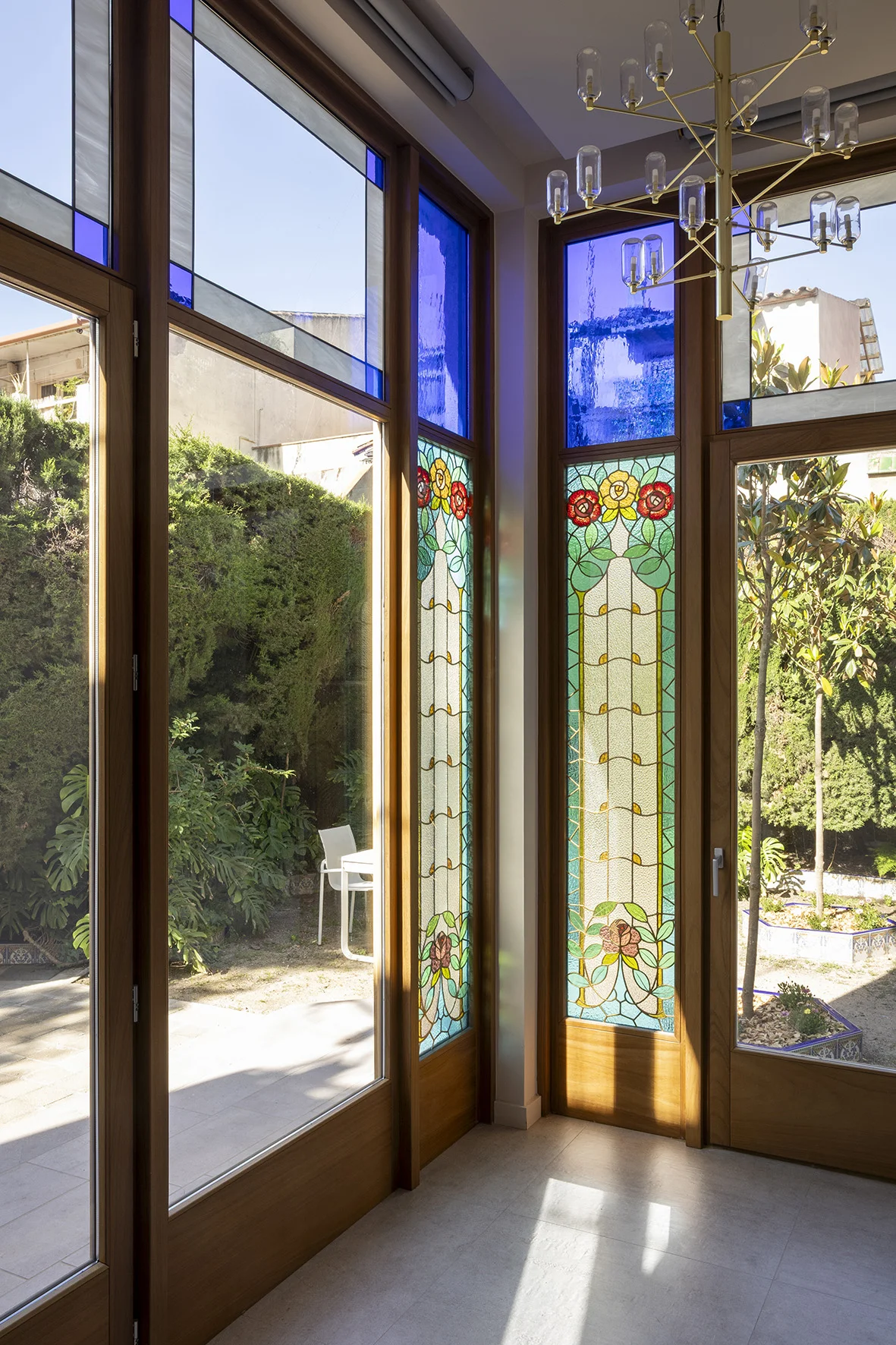 - A l’interior, s’unifiquen el menjador, la sala d’estar i la galeria en un mateix espai obert que s’estén cap al jardí. Les noves fusteries incorporen vitralls d’estil modernista, destaquen especialment els dos situats a la cantonada, punt de major presència visual, tant des de l’espai interior com del jardí exterior.