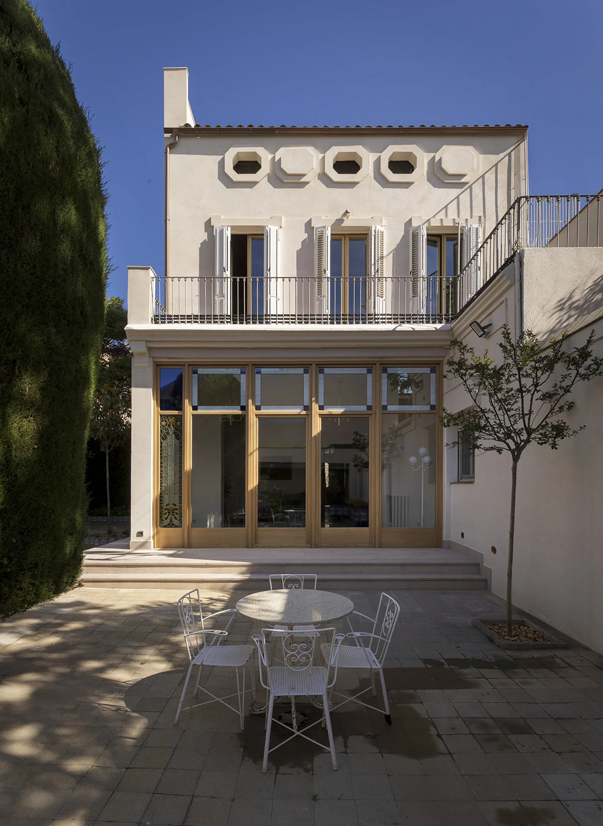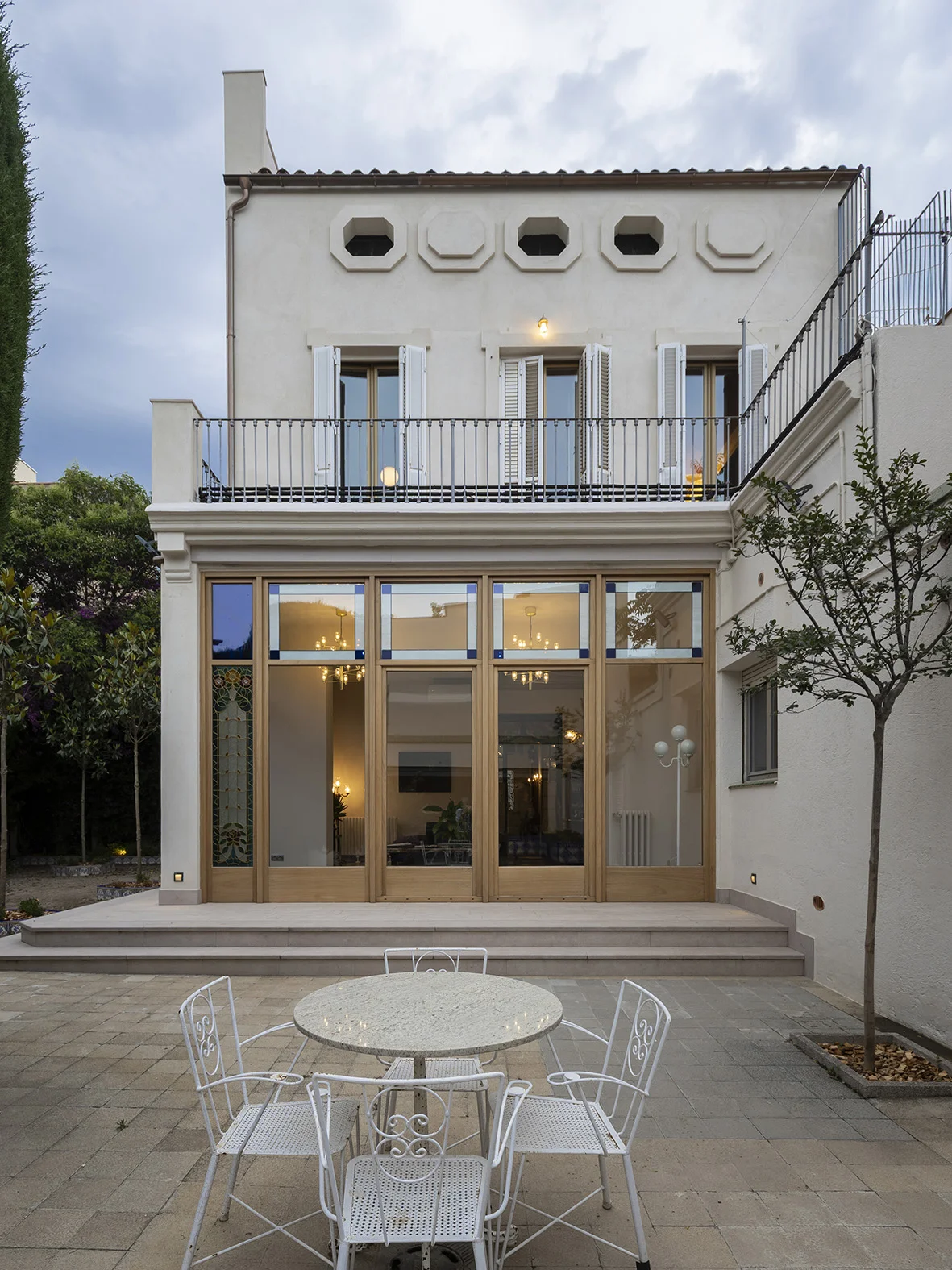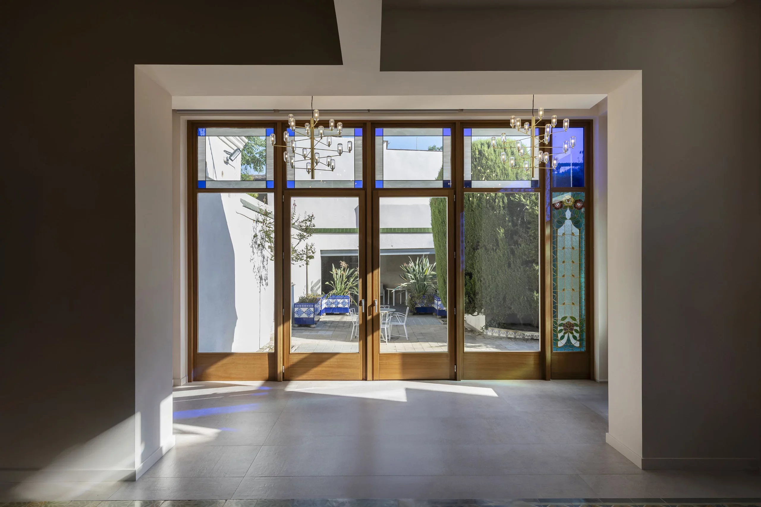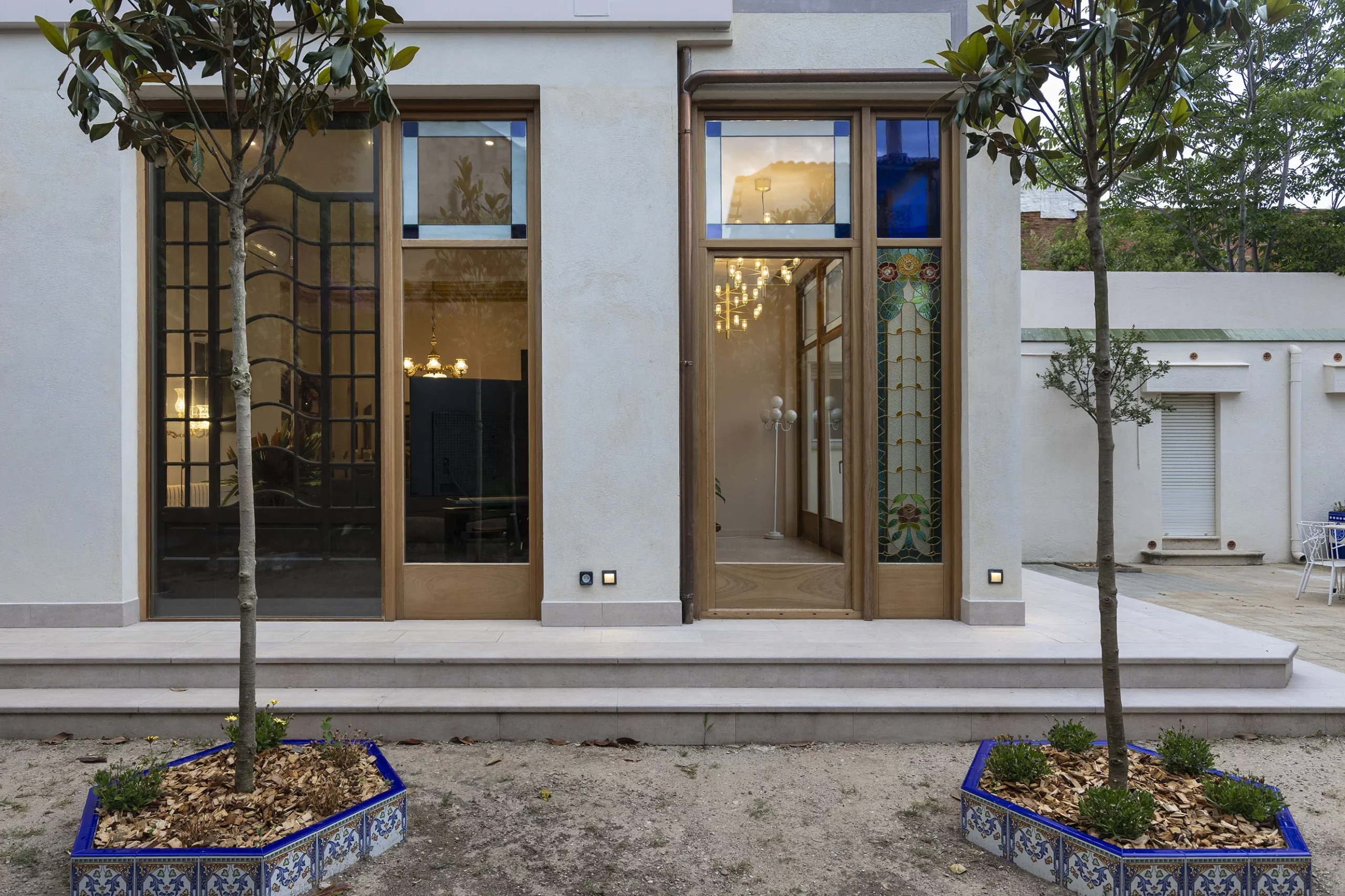 - A l’interior, s’unifiquen el menjador, la sala d’estar i la galeria en un mateix espai obert que s’estén cap al jardí. Les noves fusteries incorporen vitralls d’estil modernista, destaquen especialment els dos situats a la cantonada, punt de major presència visual, tant des de l’espai interior com del jardí exterior.